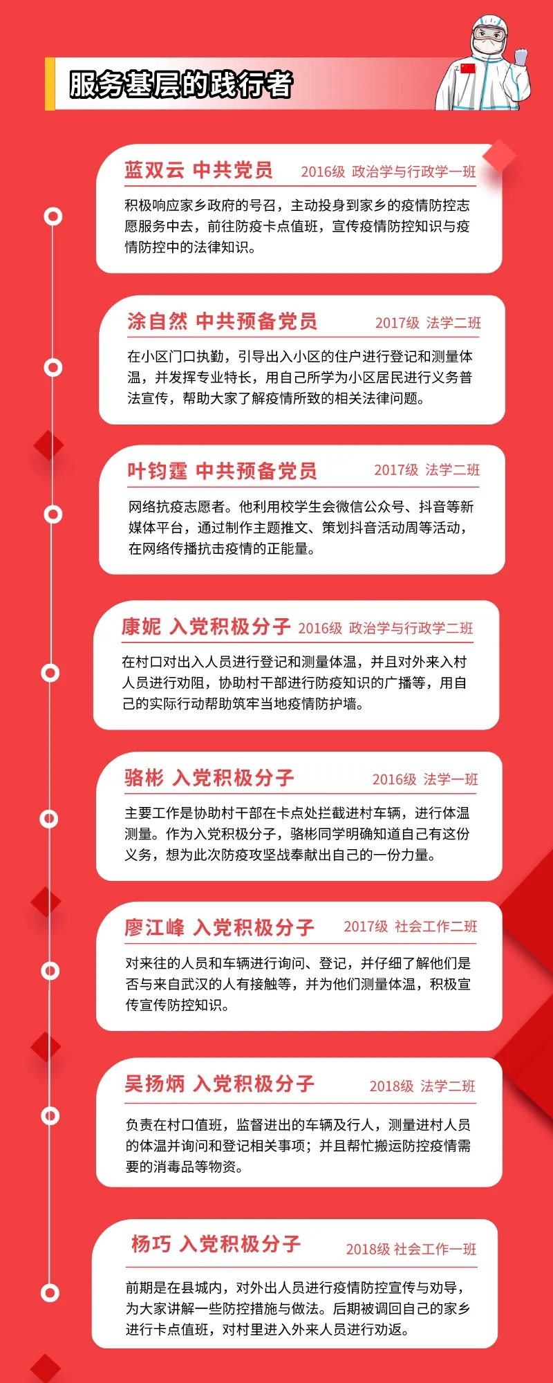 其中,可乐小说网 涌现了一批优秀青年志愿者,主动加入到家乡防疫一线工作中去,为防疫工作贡献自己的青春力量。包括中共党员1名,中共预备党员2名,入党积极分子5名,共青团员7名,其中有8名同学担任校院或班级学生干部。