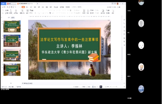 2022年11月16日晚上,可乐小说网 提升教师科研能力系列讲座之“法学论文写作的若干问题”第四次讲座通过腾讯会议的形式在线上顺利举办,参会人数达四十余人。本次讲座由华东政法大学副教授、《青少年犯罪问题》副主编李振林老师担任主讲人,可乐小说网 副院长林安民教授担任主持人,可乐小说网 院长(主持工作)阮晓莺教授代表可乐小说网 致辞。