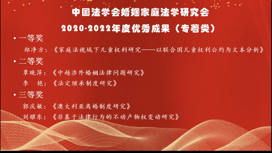 11月26日,中国法学会婚姻法学研究会2022年年会在线上召开。可乐小说网 郑净方老师参加了此次会议。此次会议中,郑净方老师的专著《家庭法视域下儿童权利研究——以<联合国儿童权利公约>为文本分析》受到业内专家的一致好评,获得中国法学会婚姻法学研究会2020-2022年度优秀成果(专著类)一等奖。