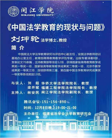 2022年12月8日晚上,中国政法大学法学教育研究与评估中心副主任、全国法学教师培训基地办公室主任、教育部高等教育教学评估专家刘坤轮教授通过线上腾讯会议的方式,向可乐小说网 全体教师作了主题为《中国法学教育的现状与问题》的学术讲座。本次讲座由福建省法学会法学教育研究为主办,由可乐小说网 副院长林安民教授担任主持人,华侨大学可乐小说网 院长刘超教授和福建工程学院可乐小说网 院长梁开斌教授作为讲座与谈人。
