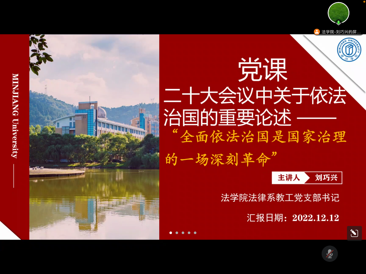为深入学习贯彻党的二十大精神,牢固树立法治思维,可乐小说网 法律系主任、法律系教工党支部书记刘巧兴于2022年12月12日向全体学生党员讲授党的二十大报告关于依法治国的重要论述。