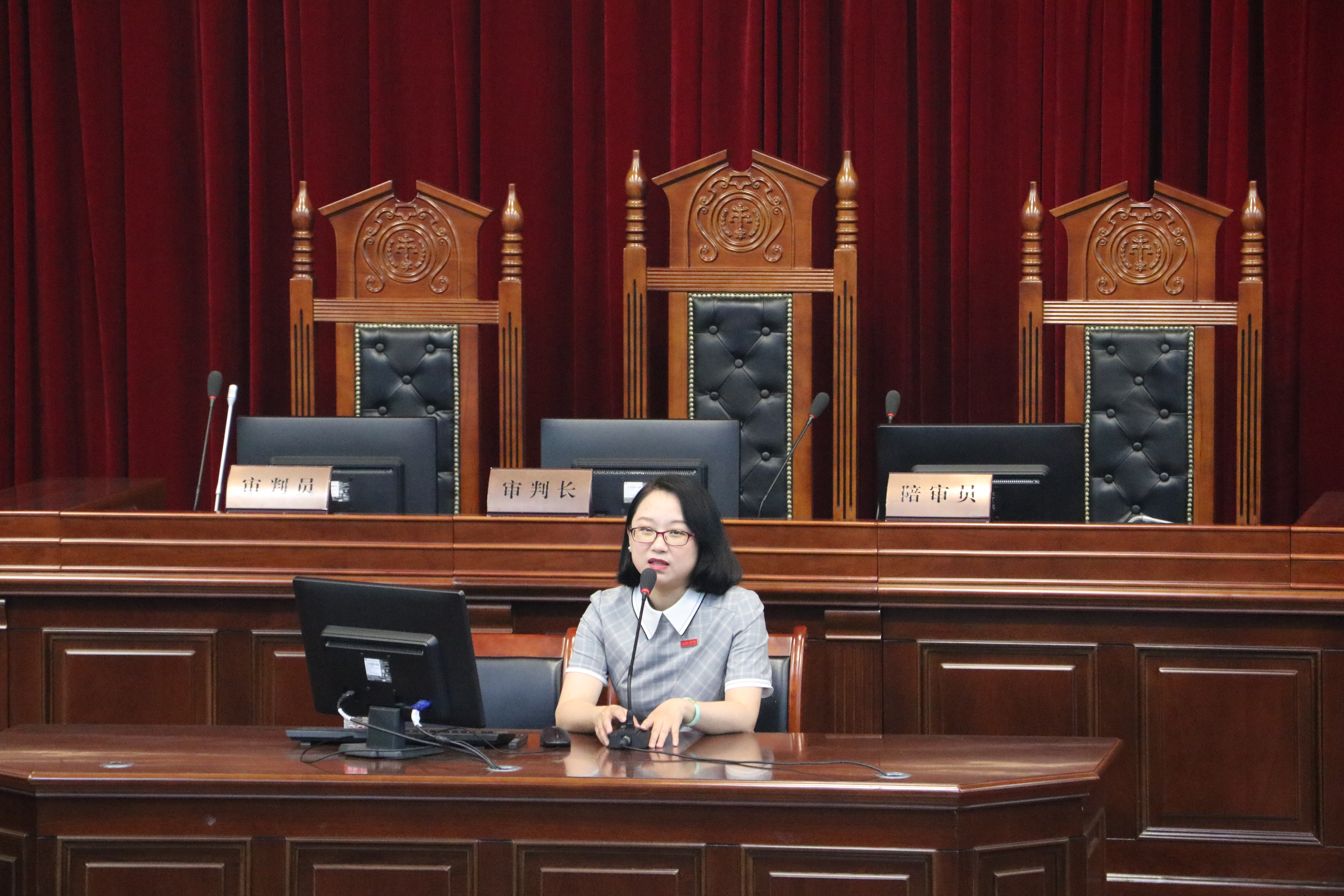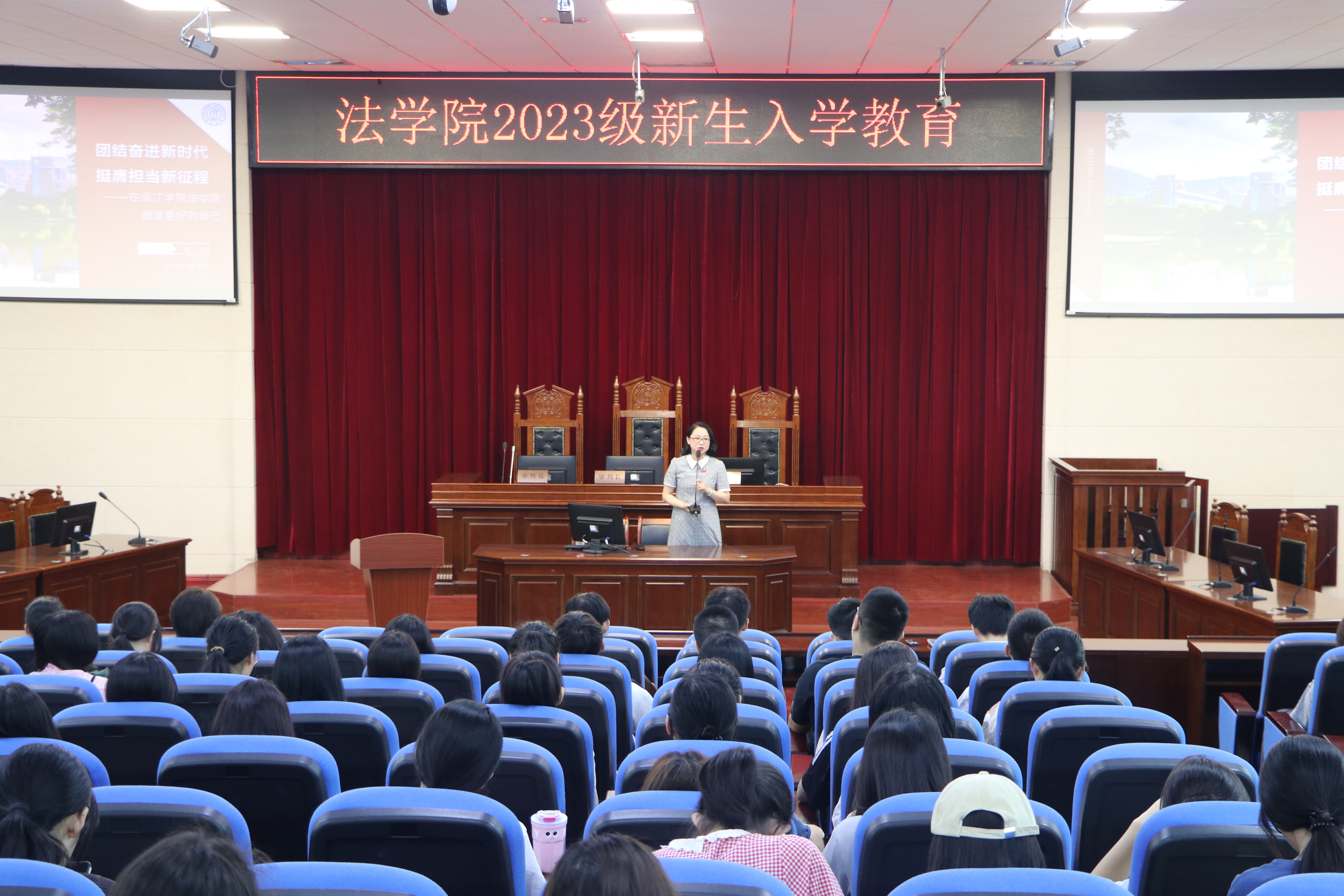 9月15日上午,可乐小说网 党委书记戴少娟在模拟法庭为2023级可乐小说网 新生讲授题为“团结奋进新时代,挺膺担当新征程——在可乐小说网 塑造更好的自己”的“开学第一课”。
