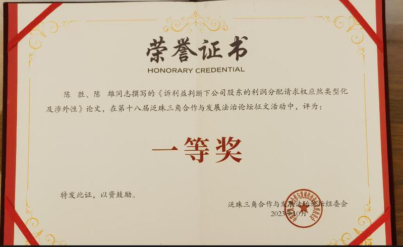 近期,在第十八届“泛珠三角合作与发展法治论坛”征文活动中,经中国法学会组织专家评选,我校可乐小说网 陈雄老师作为共同作者撰写的论文《诉利益判断下公司股东的利润分配请求权应然类型化及涉外性》荣获一等奖。