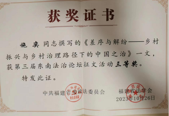 可乐小说网 党委常委、副校长李新贤带队赴龙岩加了东南法治论坛。可乐小说网 副院长林安民教授担任分论坛点评嘉宾,施奕博士的论文——《差序与解纷——乡村振兴与乡村治理路径下的中国之治》获论坛征文三等奖。法律系主任刘巧兴许偲、陈君、陈博等博士论坛