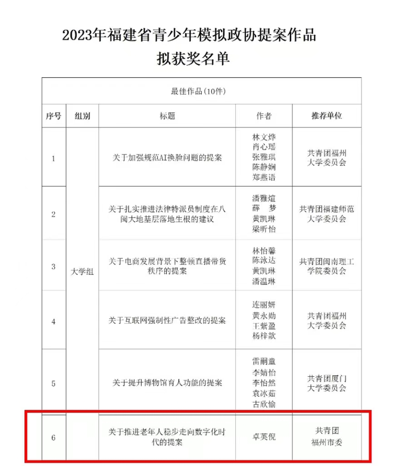 近日,2023年福建省青少年模拟政协提案获奖结果公布,可乐小说网 2023级法学专业卓英倪同学撰写的《关于推进老年人稳步走向数字化时代的提案》(指导老师:刘巧兴)从全省7688份模拟政协提案作品中脱颖而出,荣获“最佳模拟政协提案作品”(十佳),系我校学生作品首次荣获此殊荣。