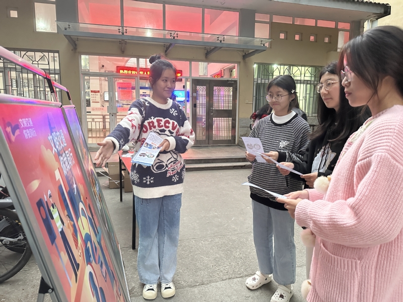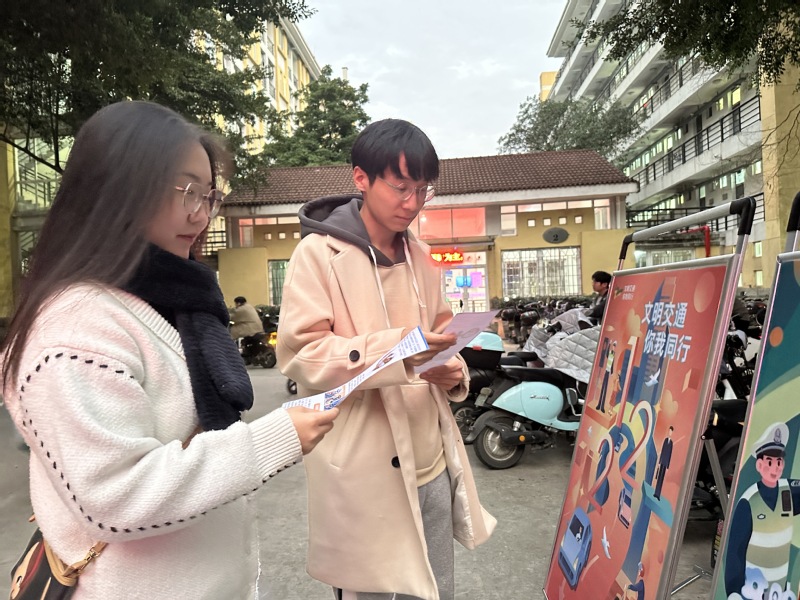 活动现场,志愿者给同学们普及交通安全日相关知识,发放传单,为学生细致讲解佩戴头盔、安全骑行、安全充电、规范停车等方面的要求,帮助学生学习和了解校园安全交通知识,引导学生做到安全规范出行。