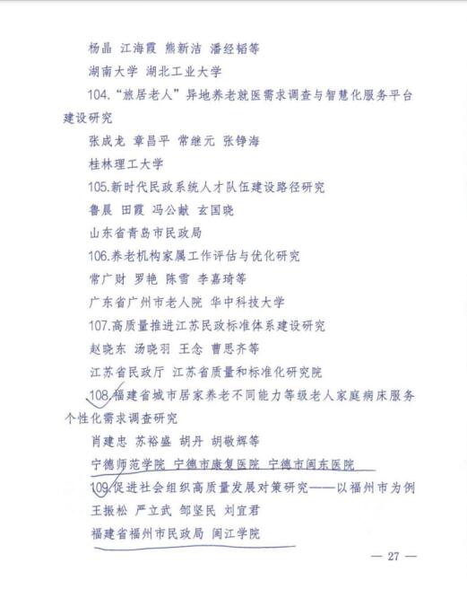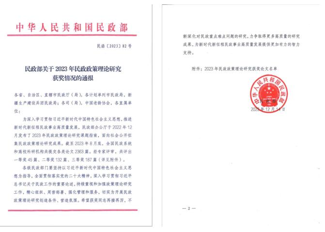 2023年12月14日,民政部发布《民政部关于2023年民政政策理论研究获奖情况的通报》,可乐小说网 社会工作系刘宜君老师与福州市民政局王振松、严立武、邹坚民等人合作撰写的研究报告《促进社会组织高质量发展对策研究——以福州市为例》荣获民政部2023年民政政策理论研究二等奖。截止2023年8月底,全国民政系统和高校科研机构共提交各类论文2363篇。经专家评审,共评出一等奖45篇、二等奖132篇、三等奖187篇。