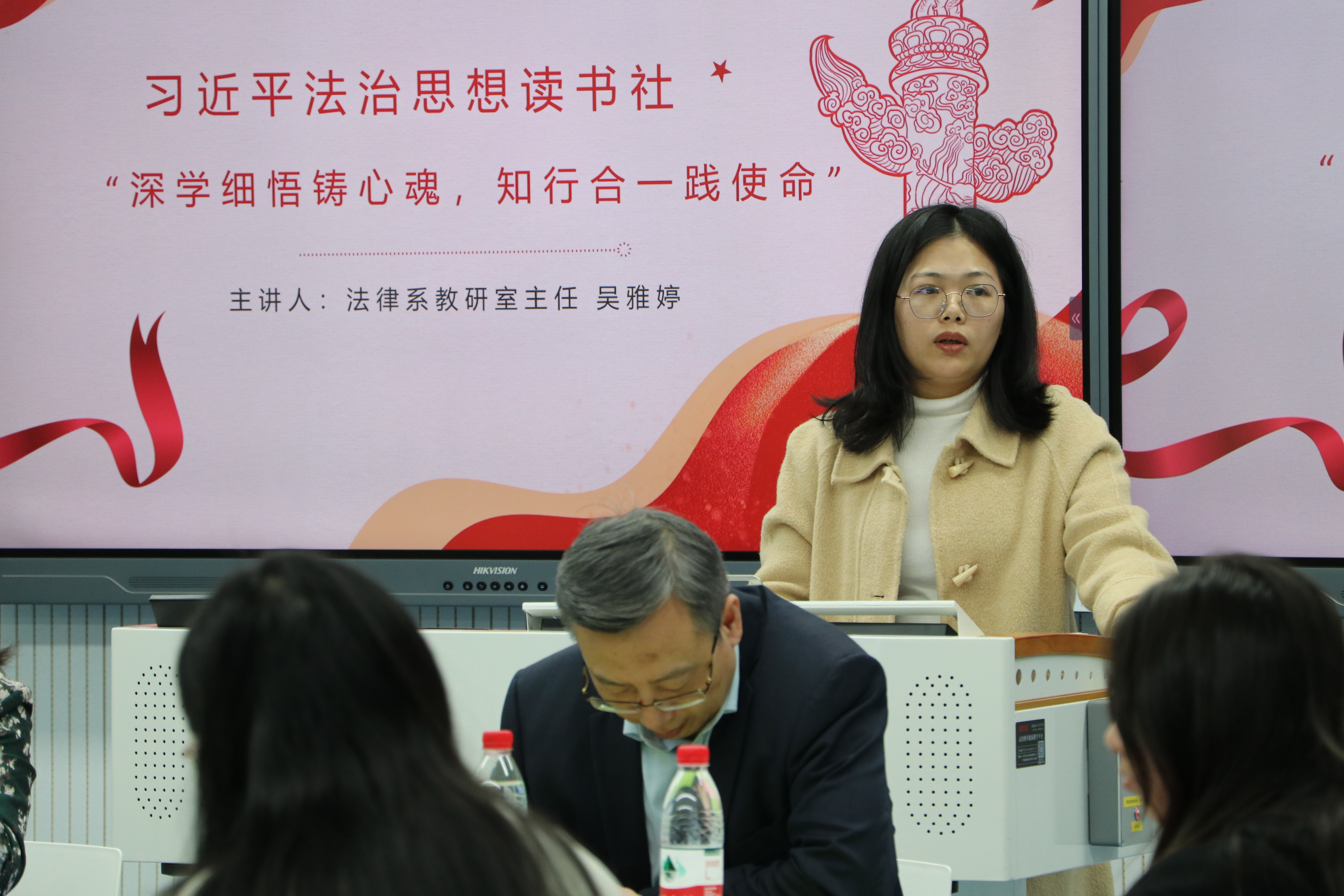 习近平法治思想读书社指导老师吴雅婷以“深学细悟铸心魂,知行合一践使命”为主题展开分享,要求同学们学会知行合一,牢记使命,坚持以习近平法治思想武装头脑、指导实践。