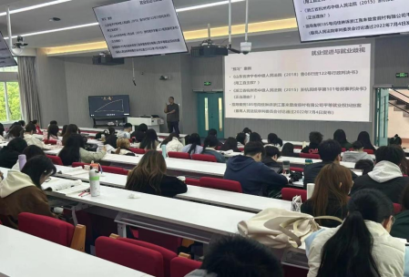 在课程依始,陈博老师带领学生共同回顾了上一堂课的知识要点,并进行细致而深入的梳理,使学生能够牢固掌握并有效衔接前后课程内容。紧接着,陈老师巧妙地运用了几个贴近生活的实例,生动鲜活地将本节课的主题“就业促进与平等就业”逐步引入课堂讨论。之后,陈老师从宏观的制度构建到微观的社会现实,全方位、多层次地剖析和解读了就业促进与平等就业的内在逻辑和实践要义。他详细解析了相关法律法规政策,并通过精心挑选的研习案例,让学生们真切感知到法律原则在实际工作和生活中的具体应用。在互动环节,陈老师鼓励学生积极参与,对就业歧视等社会热点问题展开讨论,引导他们从不同角度深入思考,从而提升学生对就业促进与平等就业的认知深度和广度。此种理论联系实际的教学方式不仅激发了学生们的求知欲,也极大地促进了他们对课程内容的深刻理解和把握,为他们未来面对职场挑战和社会问题打下了坚实的理论和实践基础。
