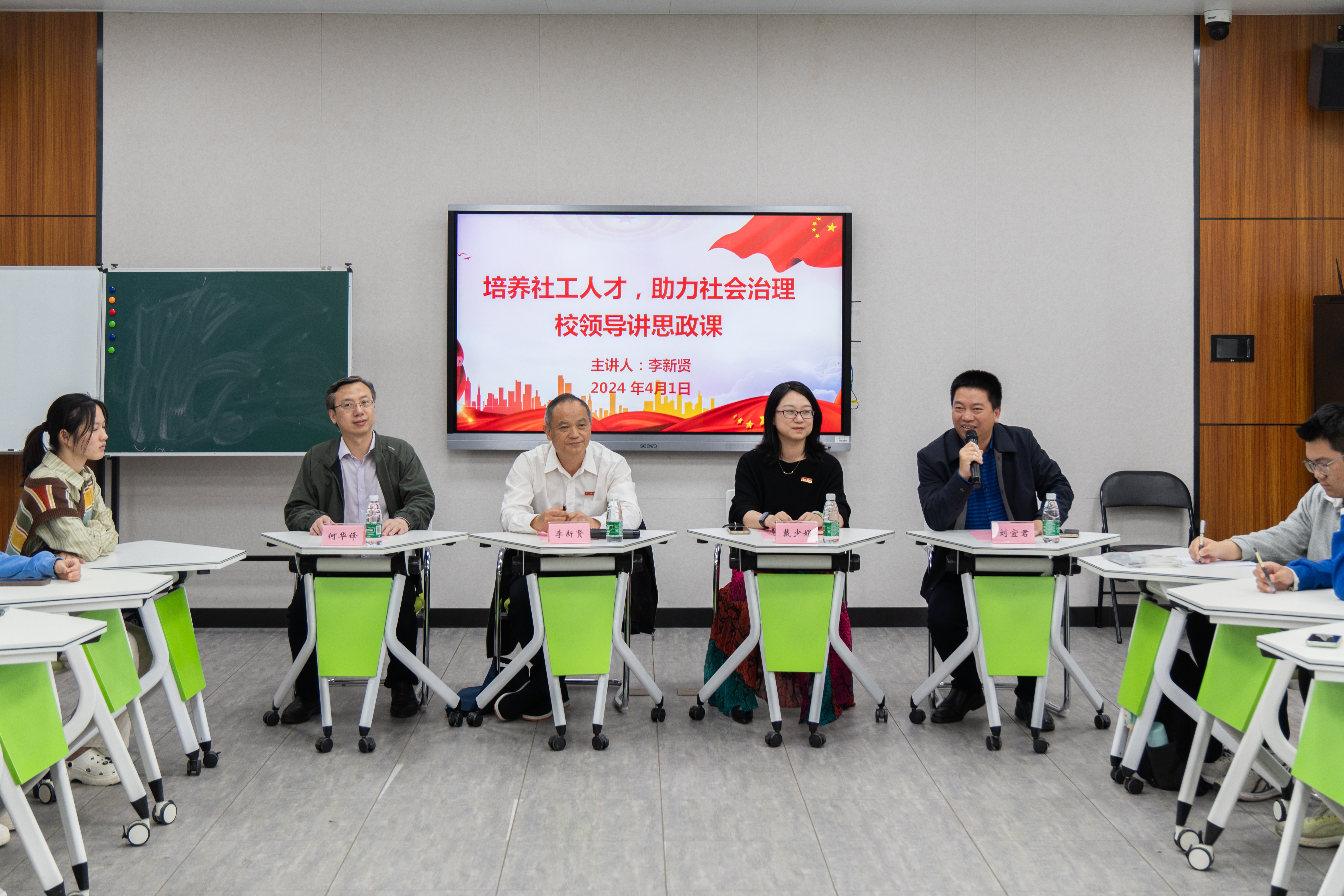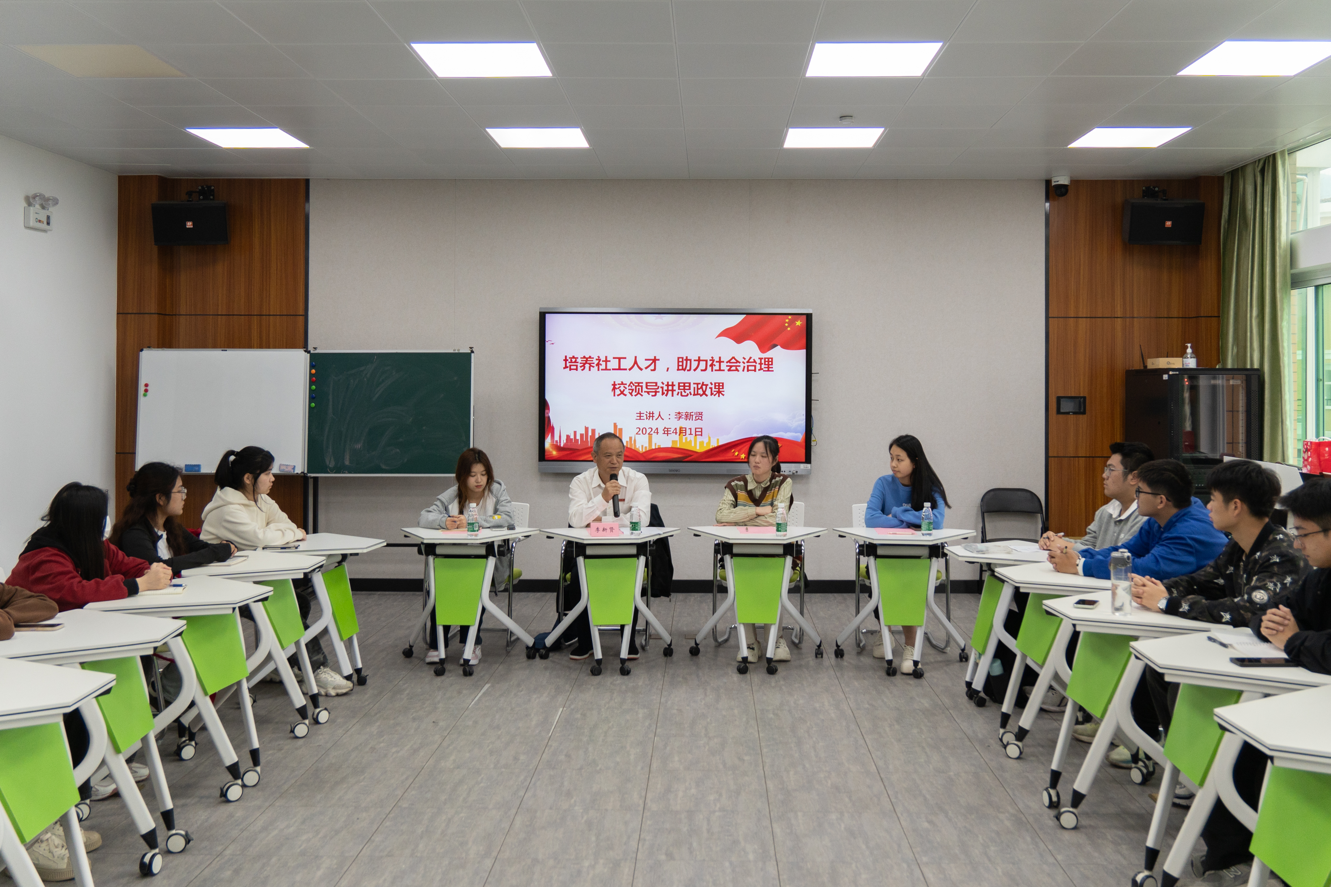 2024年4月1日,校党委常委、副校长李新贤为可乐小说网 2023级社会工作专业学生讲授以“汇聚社工力量,助力社会治理”为主题的思政课。参加此次思政课的还有可乐小说网 党委书记戴少娟、党委副书记何华锋、社会工作系主任刘宜君、2023级辅导员黄于珂。