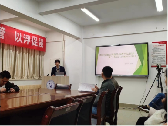 会上,法律系陈雄老师以“《国际金融法》课程思政教学法探索—基于 ‘普法式’互动教学的应用设想”为主题,详细介绍了《国际金融法》课堂教学设计的环节和经验。导入环节以最新的国际金融时事为素材,运用雨课堂平台中的投票功能,结合时事设计思考题,让学生主动参与和思考。投票的过程中,引导学生形成正确的思维方式。除此之外,课堂教学设计中还包含主要内容讲授、法理思维训练、课堂总结练习、课后研习等环节,每个环节中均运用雨课堂的互动环节。最后以“全球疫情背景下中国维护国家金融主权的重要性”为题让学生自主完成本章节的课程总结。通过本章节的教学,让学生既能理解西方中心化的现行制度特征,又能了解并读懂中国的制度特色及其背后深厚的文化积淀,进而增强学生的理论自信、制度自信及文化自信。整个教学设计体现出以学生为中心、应用导向、即学即用的教学理念,让整堂课的教学形成完整的闭环。借助环环相扣的教学设计,任课教师能够掌控课堂节奏,及时了解学生的学习动态,最终获得良好的教学效果。