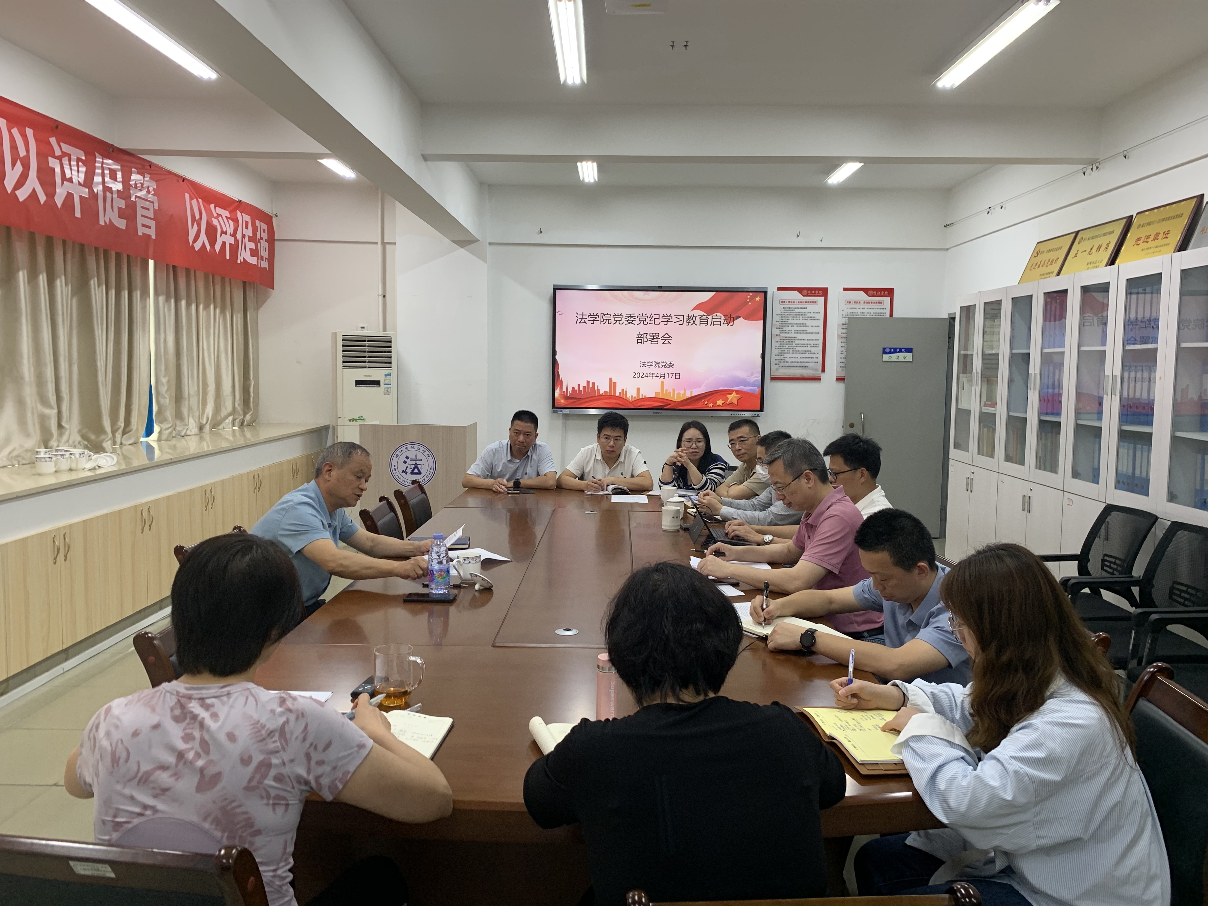 4月17日,可乐小说网 党委召开党纪学习教育启动部署会。校党委常委、副校长李新贤莅会指导,学院领导班子成员、党委委员、科级干部、党支部书记参会。受在外参加学习的学院党委书记戴少娟委托,会议由学院党委副书记何华锋主持。
