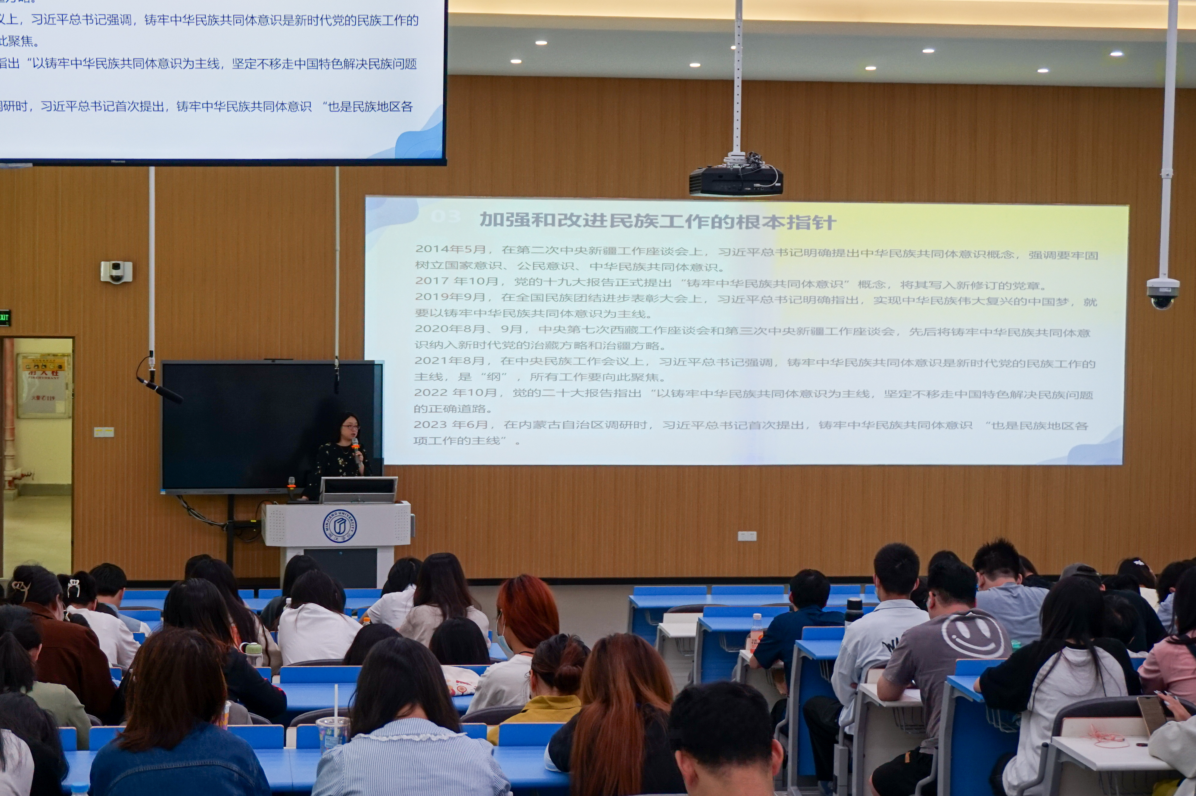 戴少娟围绕“铸牢中华民族共同体意识”主题,对铸牢中华民族共同体意识的时代背景和重大意义、深刻内涵和实践路径等进行了深入浅出的阐释。她从外部国际环境和内部民族领域两个方面,分析了党中央作出铸牢中华民族共同体意识重大决策部署的战略意义,对党关于加强和改进民族工作的重要思想即“十二个必须”进行了深入解读,帮助同学们正确理解“四个共同”“四个与共”“四对关系”,并重点针对“怎样铸牢,怎样才能铸得更牢”这一重大实践命题,对铸牢中华民族共同体意识的五条实践路径进行了解读。