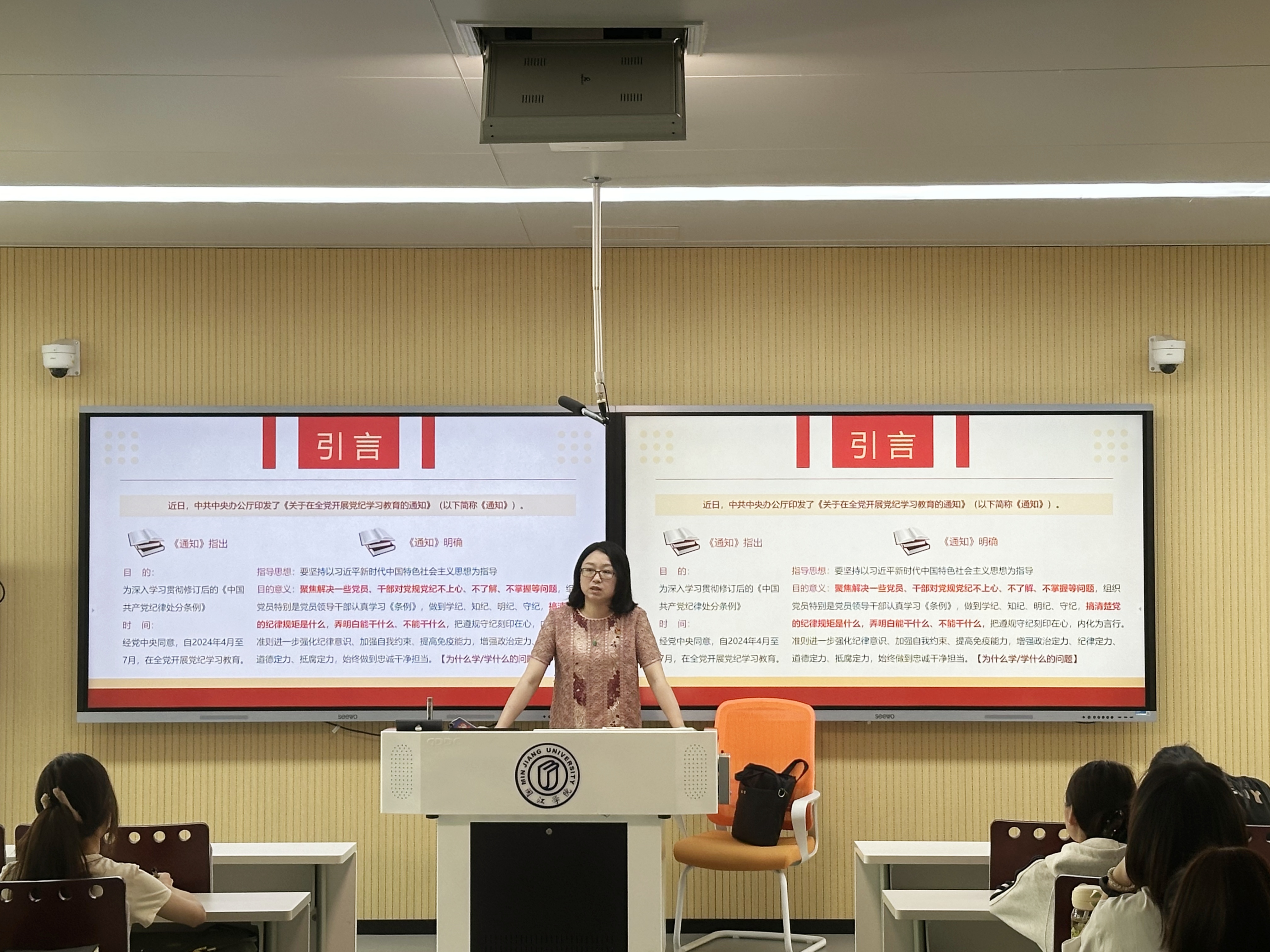 开班式结束后,戴少娟以以案明纪,以纪正行——解读《中国共产党纪律处分条例》为题,为全体学员作党纪学习教育专题党课。戴少娟围绕新修订的《中国共产党纪律处分条例》分享了自己的心得体会,详细解读了《条例》修订的重要意义、学习方法、突出特点、基础概念、充实完善的相关条款、新增或修改的重点条文等部分内容,并围绕六大纪律的重点内容,结合典型案例进行了剖析解读。