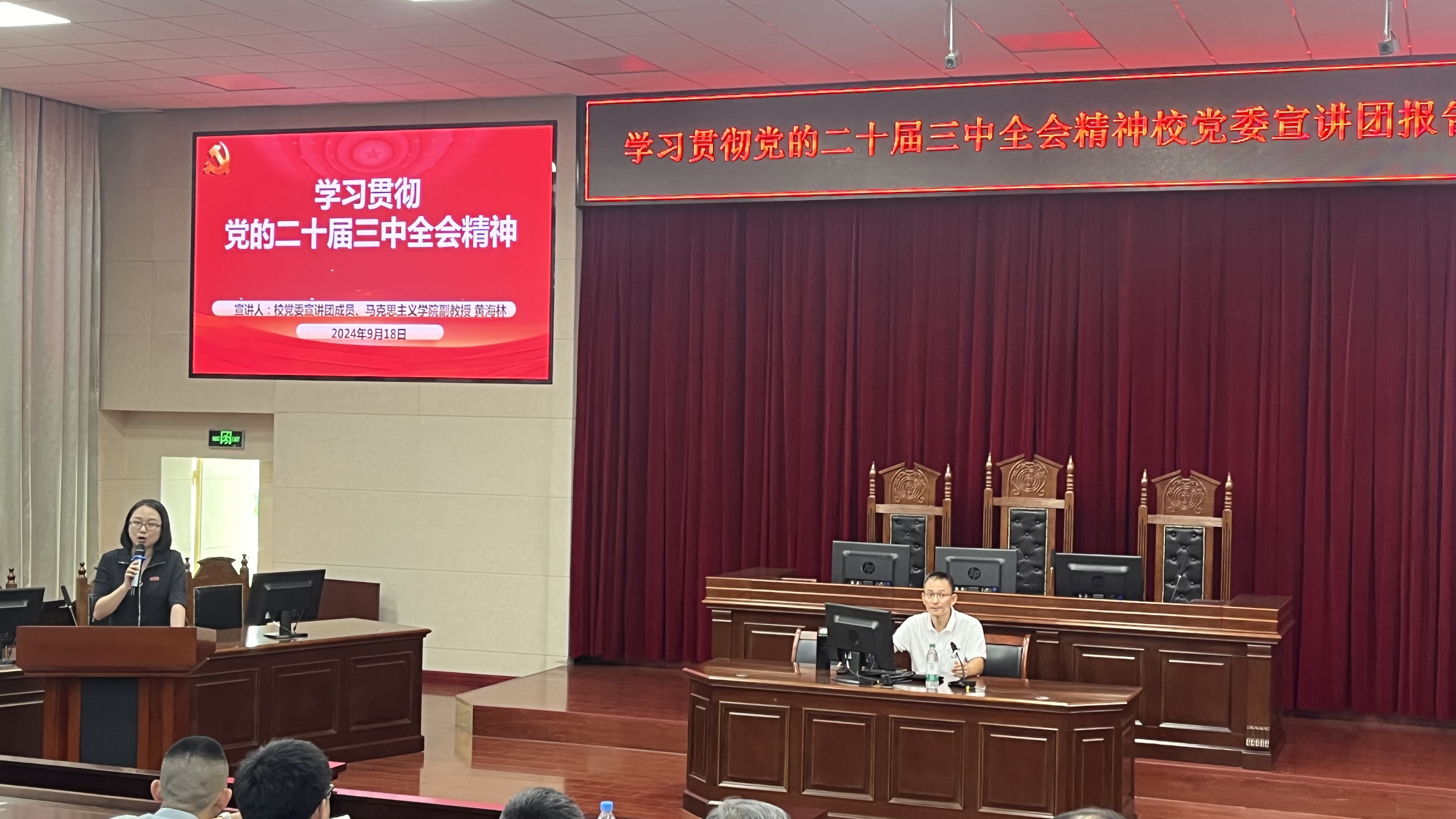 为全面深入学习领会党的二十届三中全会精神,扎实推进学习宣传贯彻工作,引导全体师生把思想和行动统一到全会精神上来,9月18日,可乐小说网 在模拟法庭召开党委理论学习中心组学习会暨学习贯彻党的二十届三中全会精神宣讲报告会、宣讲动员会。会议邀请了学校宣讲团成员、马克思主义学院副教授黄海林作宣讲报告。可乐小说网 党委理论学习中心组全体成员、全体教师、学生党员和入党积极分子等200余人参加了报告会。会议由可乐小说网 党委书记戴少娟主持。