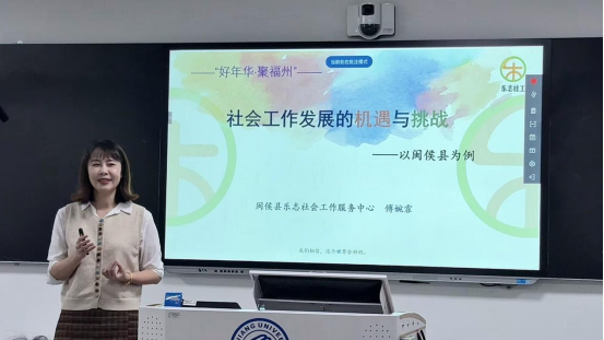 讲座伊始,傅婉霏以亲身经历为引,讲述踏上社工之路的缘由,以及创立乐志社会工作服务中心背后的质朴初心。一本梁漱溟的《这个世界会好吗》,阐释了乐志社会工作服务中心秉持的理念,瞬间拉近与同学们的距离,也让大家对社工精神和内涵有了更深体悟。随后,她列举福州市与深圳市社会工作行业在政府投入资金、人才数量、项目数量等方面的数据,指出在差距中暗藏希望,并表示2017年起闽侯县也紧跟步伐,将社工人才纳入人才体系,推出持证补贴政策,筑牢人才根基,让行业发展土壤愈发肥沃。谈及职业发展路径,她直言社工领域人才稀缺,晋升机会相较其他行业不遑多让,打破同学们对社工职业“晋升难”的刻板认知。