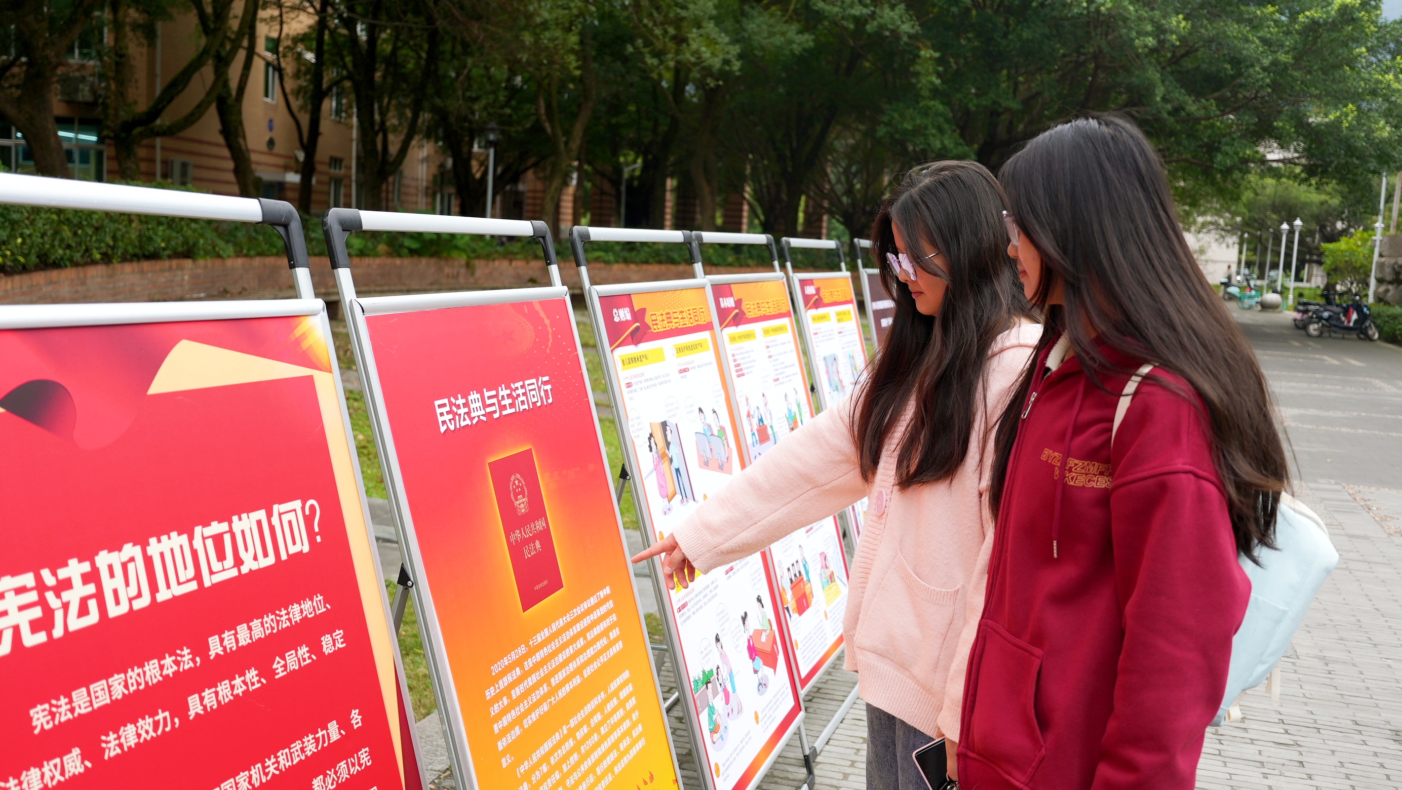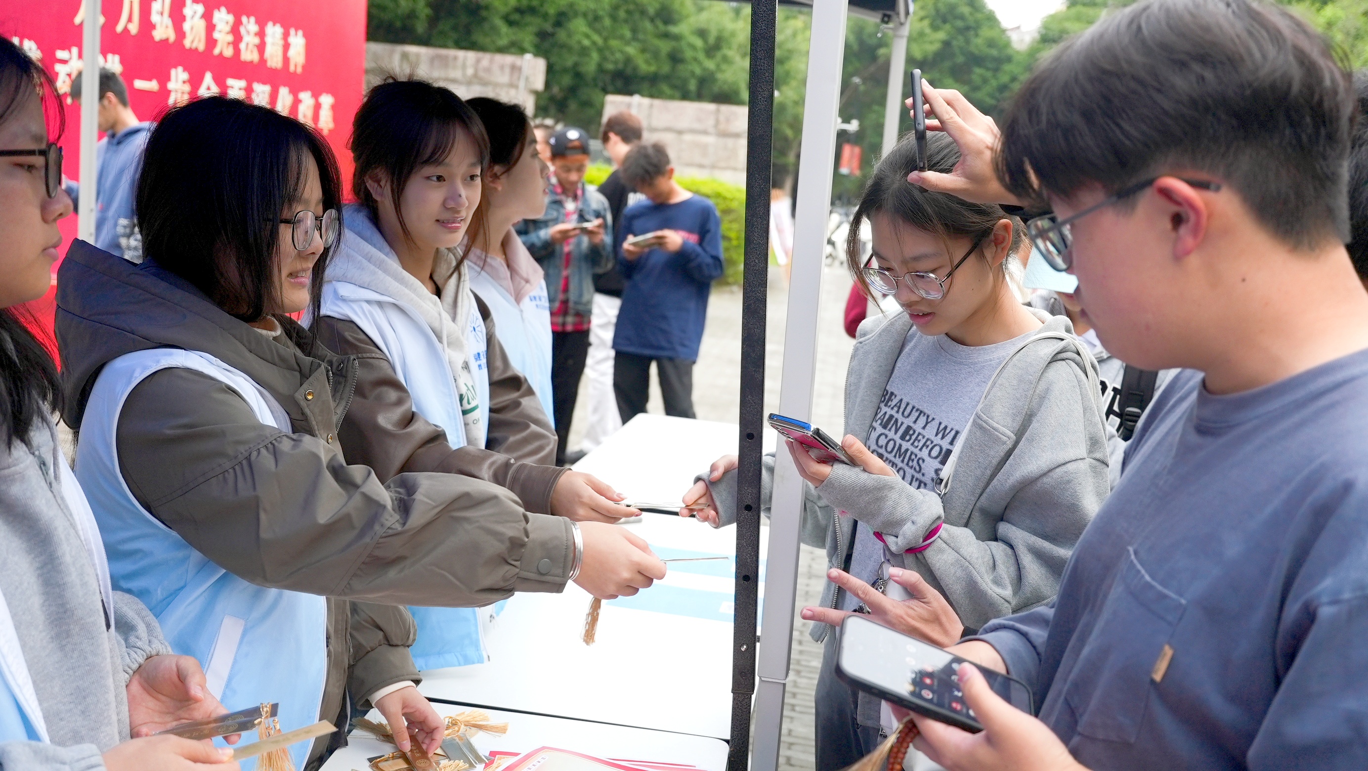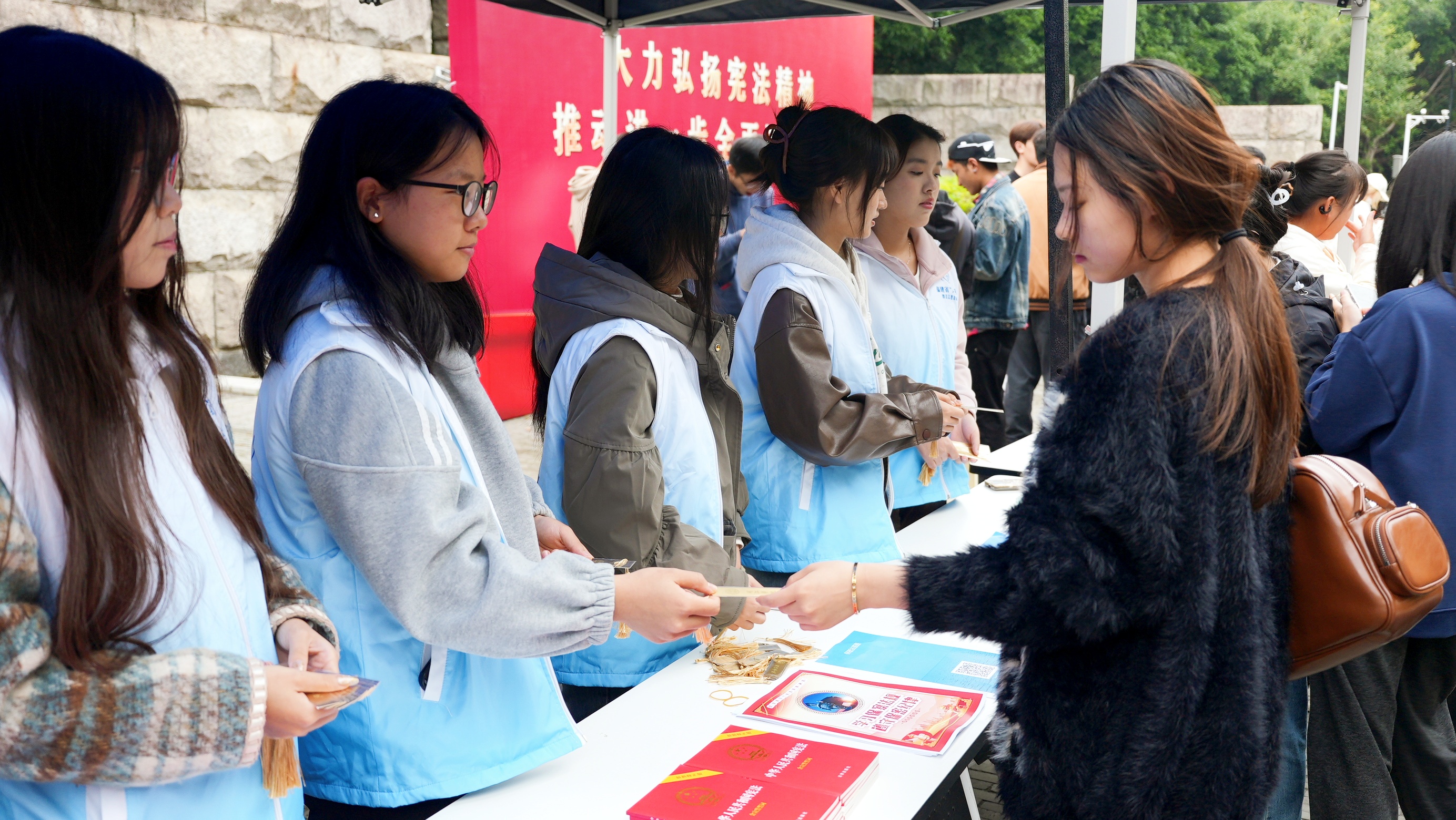 活动现场,普法志愿者通过发放宣传手册,为师生答疑解惑、普及法律知识。
