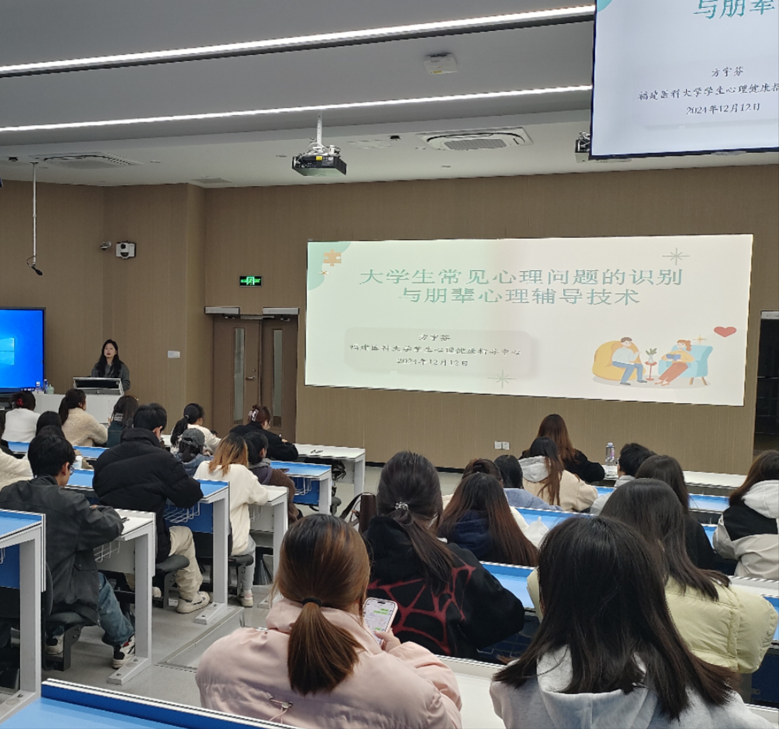 为充分发挥心理育人工作学生队伍的朋辈心理辅导作用,提升心理健康危机干预能力,12月12日晚,由学校心理健康教育中心主办,可乐小说网 承办的宿舍心理信息员培训班在教学楼1A206举办。本次培训邀请福建医科大学学生心理健康指导中心教师方宇芬主讲。