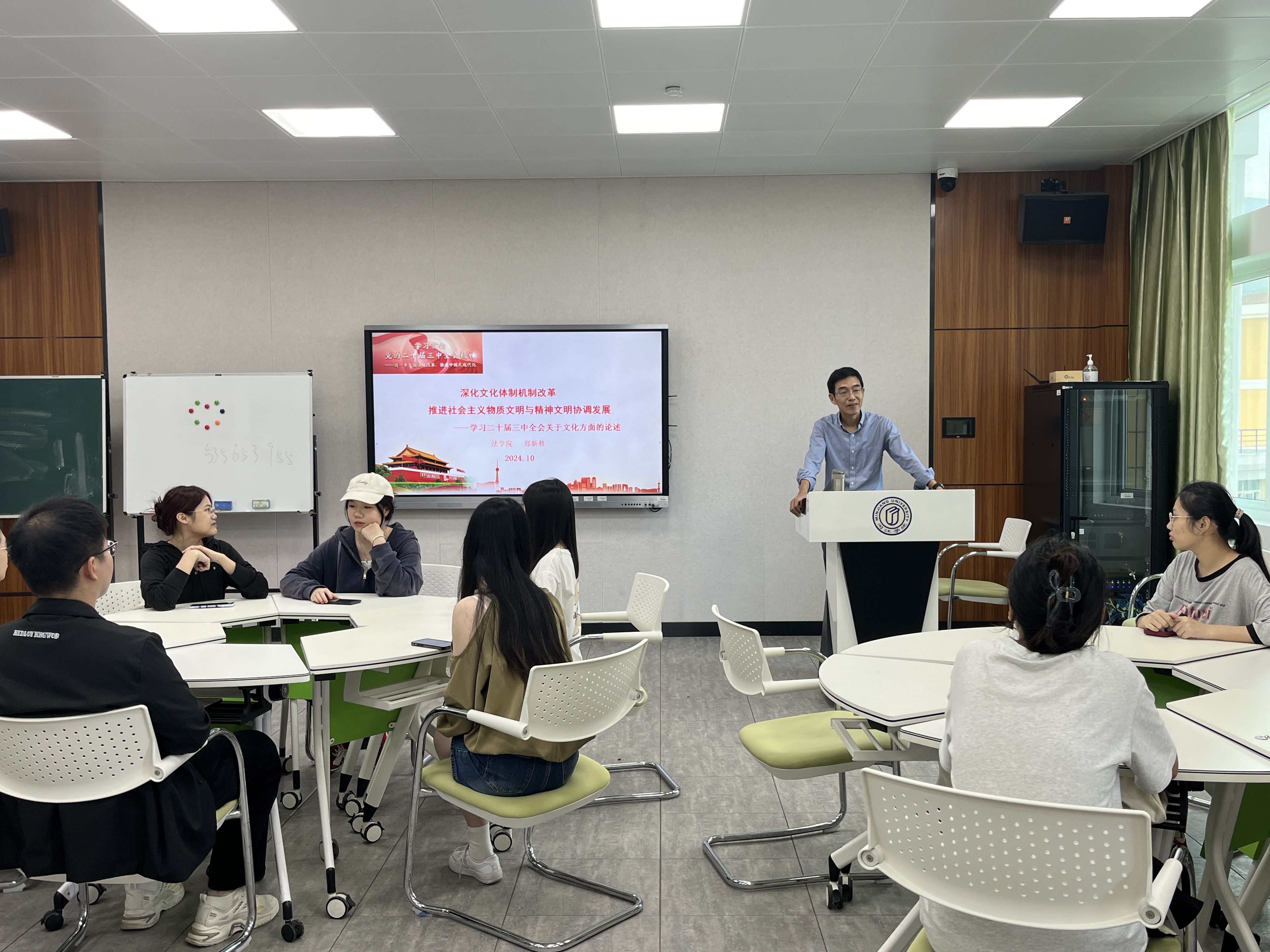 郑新胜以《深化文化体制机制改革,推进社会主义物质文明与精神文明协调发展》为题,围绕习近平文化思想内涵,引导学生学习党的二十届三中全会关于文化方面的论述,他指出在中国式现代化的伟大征程中,物质文明与精神文明相协调的发展模式不仅展现了社会主义制度的独特优势,也为我们提供了一个深刻洞察传统文化与现代化关系的视角,他鼓励同学们积极探索优秀传统文化与现代科技深度融合的路径,为实现中华民族伟大复兴的中国梦提供强大的文化支撑和精神动力。