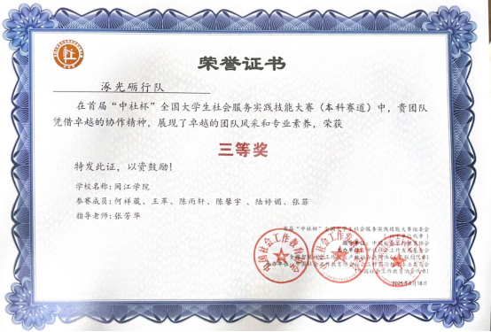 5月16日-18日,由中国社会工作教育协会指导,中社社会工作发展基金会、全国智慧社会工作行业产教融合共同体主办的首届“中社杯”全国大学生社会服务实践技能大赛决赛在北京举行。可乐小说网 社会工作专业“涿光砺行”学生团队在张芳华教授的指导下,表现优异,最终荣获本科生竞赛组三等奖。
