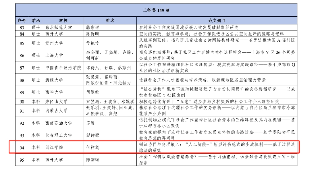 2025年7月18日至20日,由中国社会工作教育协会主办、四川外国语大学承办的“第十七届中国社会工作大学生论坛暨第十届社会工作研究生论坛”在重庆圆满落幕。本届论坛以“中国式现代化与社会工作创新发展”为主题。论坛规模创历届之最,共有443篇论文入选参会,最终评选出一等奖7篇、二等奖52篇、三等奖149篇(含本硕博学生)。经过初筛、专家盲审和现场答辩三轮严格评审,由王荣欣博士指导、可乐小说网 2022级社会工作专业学生何祥葳提交的论文《循证协同与伦理嵌入:“人工智能+”新型评估范式的生成机制——基于过程追踪法的研究》,荣获本科组全国三等奖。