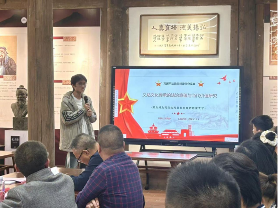 在学生分享环节中,23级创新班郑周铮同学基于暑期驻村调研的成果,分享了自己关于义姑文化传承的法治意蕴与当代价值的研究与见解。习近平法治思想读书社成员24级创新班王艺珺以村史馆、家风堂为例分享了“三治融合”视域下传统伦理的现代转换。